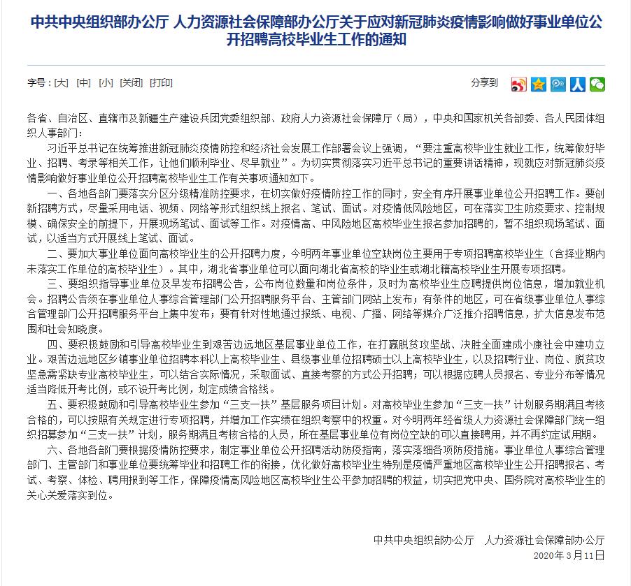 近日,中央組織部辦公廳、人力資源社會保障部辦公廳印發(fā)《關(guān)于應對新冠肺炎疫情影響做好事業(yè)單位公開招聘高校畢業(yè)生工作的通知》,要求認真落實分區(qū)分級精準防控要求,在切實做好疫情防控工作的同時,安全有序開展事業(yè)單位公開招聘工作。