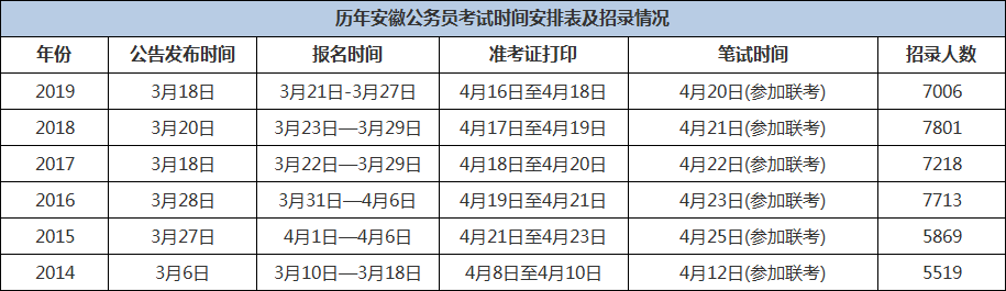 由上表可見,安徽公務(wù)員考試時(shí)間比較穩(wěn)定,每年3月中下旬左右出公告和報(bào)名,筆試時(shí)間4月中下旬,且近幾年都參加聯(lián)考,所以安徽繼續(xù)參加2020年聯(lián)考的幾率非常大,如果今年繼續(xù)參加(具體時(shí)間安排以2020年安徽公務(wù)員公告為準(zhǔn))。