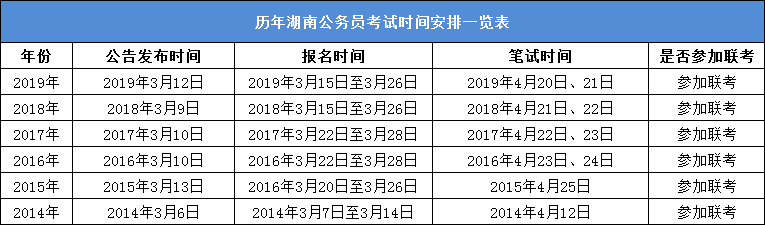 下附歷年湖南公務(wù)員考試時(shí)間安排: