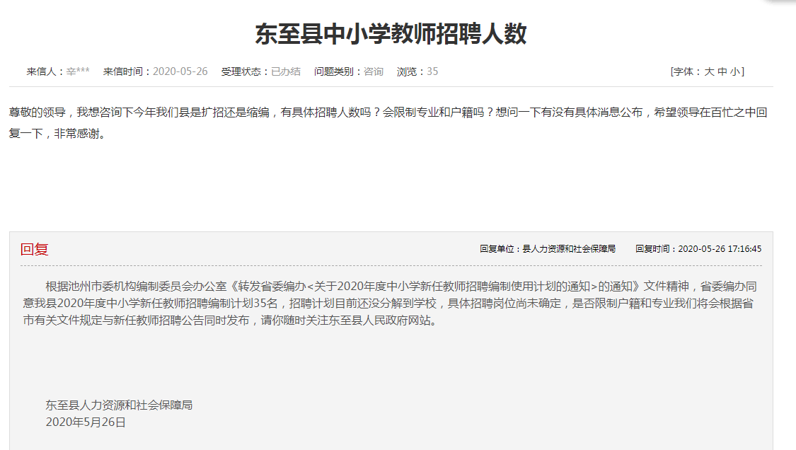 縣人力資源和社會保障局回復(fù)根據(jù)池州市委機(jī)構(gòu)編制委員會辦公室《轉(zhuǎn)發(fā)省委編辦<關(guān)于2020年度中小學(xué)新任教師招聘編制使用計劃的通知>的通知》文件精神,省委編辦同意我縣2020年度中小學(xué)新任教師招聘編制計劃35名,招聘計劃目前還沒分解到學(xué)校,具體招聘崗位尚未確定,是否限制戶籍和專業(yè)我們將會根據(jù)省市有關(guān)文件規(guī)定與新任教師招聘公告同時發(fā)布,請你隨時關(guān)注東至縣人民政府網(wǎng)站。