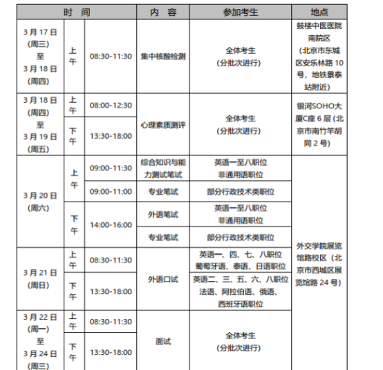 近年來,外交部的面試形式均為結(jié)構(gòu)化面試,面試時間為20-30分鐘,題量4-11題,考官讀題。除了面試之外,還需進行相應的專業(yè)能力測試和心理素質(zhì)測試,其中專業(yè)能力測試包括綜合知識與能力測試(筆試)、專業(yè)筆試、外語筆試、外語口試;心理素質(zhì)測試分批次進行,不計入綜合成績。