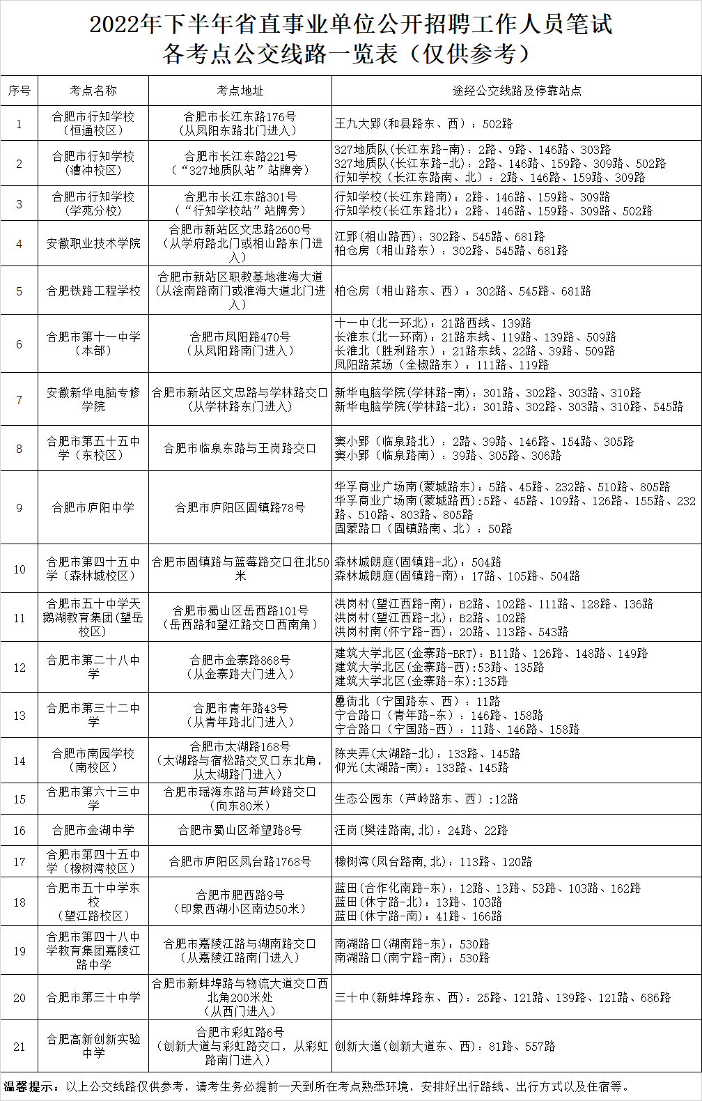 2022年下半年省直事業(yè)單位公開招聘工作人員筆試各考點公交線路一覽表(僅供參考)