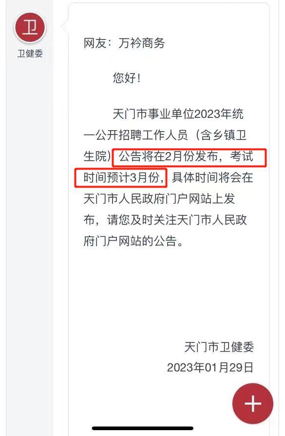 天門衛(wèi)健委回復(fù):天門市事業(yè)單位2023年統(tǒng)一公開(kāi)招聘工作人員(含鄉(xiāng)鎮(zhèn)衛(wèi)生院)公告將在2月份發(fā)布,考試時(shí)間預(yù)計(jì)3月份……