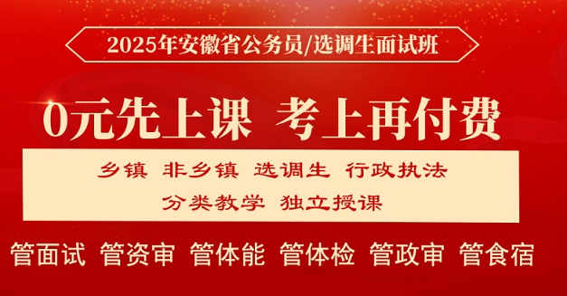 我們根據(jù)歷年面試考情定制了2025年安徽省公務(wù)員面試班,業(yè)內(nèi)實(shí)力專家團(tuán)隊(duì)將與您并肩戰(zhàn)斗!我們將提供科學(xué)的課程安排與出色的心理訓(xùn)練和技術(shù)指導(dǎo),戰(zhàn)勝一切對(duì)手!助您成公!