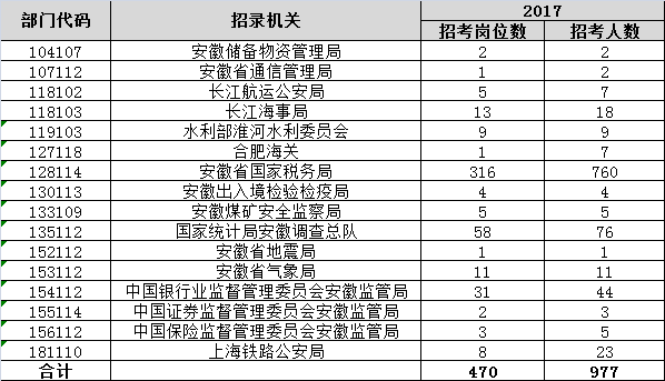 2018國家公務(wù)員考試職位表(安徽地區(qū))共招聘470崗位,977人。