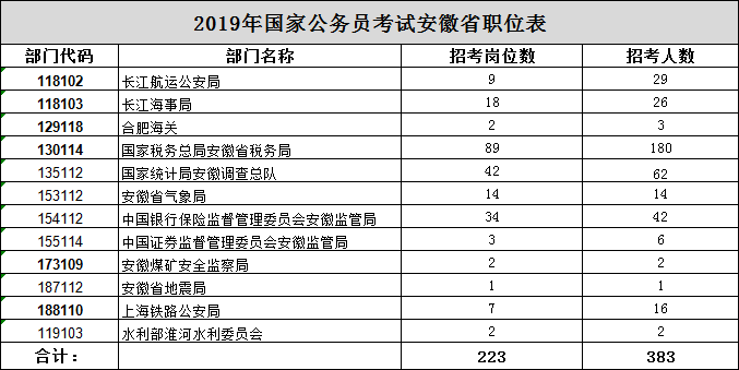 2019國家公務(wù)員考試職位表(安徽招383人,共223個崗位) |
