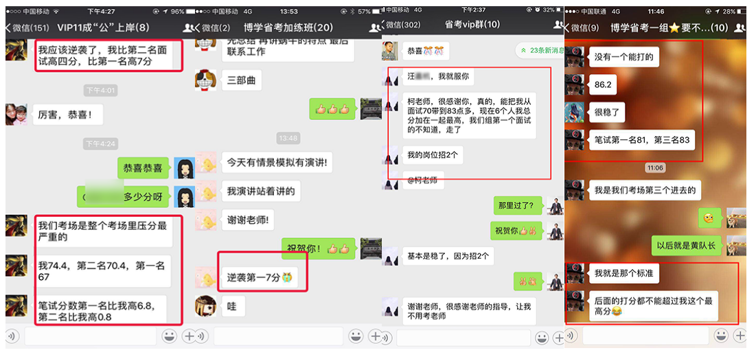 在2010年—2018年國考中,很多人僅僅是因為看了網上博學教育公務員班的幾段視頻,就毫不猶豫地選擇博學教育,最終成功地實現了他們的公務員之夢。2010年安徽省考高陽同學面試取得88.4的高分,一舉從筆試第23名躍居為綜合排名第一名,成為巢湖市面試狀元;胡卓然同學以86分的成績勇奪南京市第一名,被南京市國土資源局錄取。廣東的鄭滋潤同學,數次公考面試失敗,2011年慕名來到博學施老師門下,經過七天學習,脫胎換骨,以91分的成績遙遙領先對手被財政部駐深圳市專員辦錄?。?011年安徽省考季毓同學面試取得88的高分,成為馬鞍市面試狀元;2012年上海的潘安安同學,以88.3的高分被上海海關隸屬海關通關業(yè)務部門錄取。2013年福建的王子熙同學,以89.4的高分被廈門海關廈門地區(qū)隸屬海關或辦事處錄取。2013年安徽省考牛園園同學取得面試86.8分,成為亳州市面試狀元!2014年安徽的曹珍同學,以86.8的成績勇奪安徽省直面試狀元,被安徽省女子監(jiān)獄錄取。2015年國考安徽的曹燦同學,以92.25分的成績被中國銀行業(yè)監(jiān)督管理委員會安徽監(jiān)管局錄取!2015年安徽省考陳雯同學以面試87.2的高分勇奪蕪湖市面試狀元;趙錦同學以面試86.4的高分取得天長市面試狀元;查菁文同學以面試86的高分取得定遠縣面試狀元。2016年國考面試,張雨豪以91分的成績被甘肅省國家稅務局錄取。2016年安徽省考陳蓉同學以面試86.8分取得馬鞍山市非鄉(xiāng)鎮(zhèn)公務員面試狀元;2017年國考,劉大偉勇奪山東省面試狀元,以98.67分被商務部錄??;阮帆同學面試取得91.33分,上海市國稅錄??;鄭想同學面試取得90.3分,上海國稅錄;2017年安徽省考顧博賢同學以面試88分取得利辛縣非鄉(xiāng)鎮(zhèn)公務員面試狀元。2018年國考徐起以87.33分被中央國家機關工委錄取,夏鈺以88.33分被中國浦東干部學院錄取。2018年安徽省考,周陽以83.8分取得銅陵市鄉(xiāng)鎮(zhèn)層級面試狀元;魏宇以82.8分取得亳州市鄉(xiāng)鎮(zhèn)層級面試狀元!